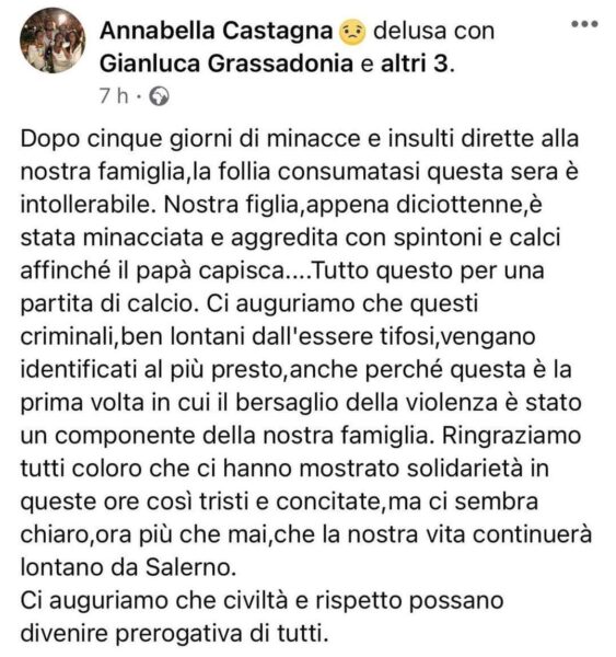 La Salernitana ha rilasciato un comunicato ufficiale per condannare i comportamenti intimidatori di alcuni personaggi, mentre la madre, Annabella Castagna, su Facebook ha descritto lo stato d’animo della famiglia e di sua figlia Paola.