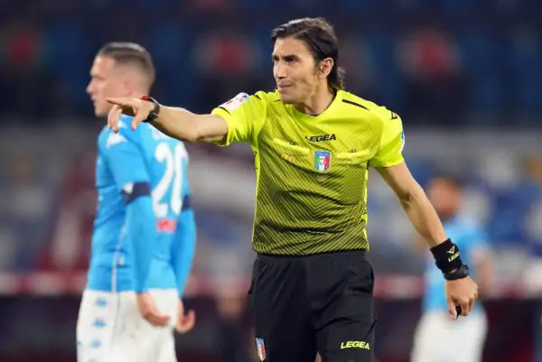 NAPLES, ITALY - MAY 11: The referee Gianpaolo Calvarese gestures during the Serie A match between SSC Napoli and Udinese Calcio at Stadio Diego Armando Maradona on May 11, 2021 in Naples, Italy Copyright: xFotoagenziax