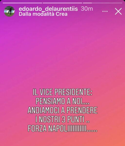 È un momento chiave per la stagione del Napoli, lo sa anche il vice presidente del Napoli Edoardo De Laurentiis, che attraverso una storia su Instagram ha dato la carica alla squadra prima della fondamentale gara contro la Fiorentina:
