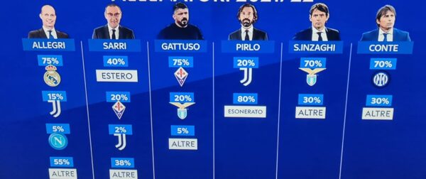 Nel corso de “Il Club” su Sky Sport, si parla del giro panchina che potrebbe coinvolgere mezza Serie A il prossimo anno. Gli allenatori coinvolti riguardano tutte le big del campionato. Nessuno di questi ad oggi infatti sembra essere sicuro di rimanere nel proprio club nella prossima stagione.