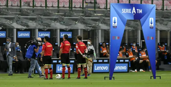 IPP20200701 Football - soccer: Serie A, Inter Mailand - Brescia Calcio, la terna arbitrale in campo prima delle squadre Verwendung nur in Deutschland - GERMANY ONLY *** IPP20200701 Football soccer Serie A, Inter Milan Brescia Calcio, la terna arbitrale in campo prima delle squadre Use only in Germany GERMANY ONLY PUBLICATIONxINxGERxONLY