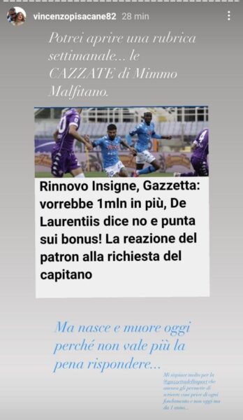 L’agente del capitano azzurro, Vincenzo Pisacane, stamane sul suo profilo Instagram, ha tuonato con veemenza contro la Rosea, sostenendo la falsità di quanto scritto nelle proprie pagine odierne sulla situazione contrattuale e sulla trattativa in corso per far restare il capitano del Napoli in magli azzurra. “Potrei aprire una rubrica settimanale: le C***ATE di Mimmo Malfitano“, così ha scritto Pisacane in una story su Instagram, che pubblichiamo di seguito.