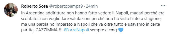 “In Argentina addirittura non hanno fatto vedere il Napoli, magari perché era scontato. Non voglio fare valutazioni perché non ho visto l’intera stagione, ma una parola ho imparato a Napoli che va oltre tutto e usavamo in certe partite: CAZZIMMA!!! Forza Napoli sempre e comunque”.