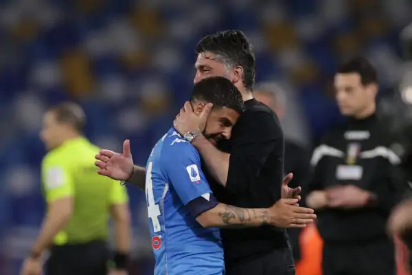 Lorenzo Insigne of SSC Napoli celebrates with team mate after scoring the goal 5-1 and Gennaro Gattuso coach during the Serie A football match between SSC Napoli and Udinese Calcio at Diego Armando Maradona stadium in Napoli Italy, May 11th, 2021. Photo Cesare Purini / Insidefoto CesarexPurini