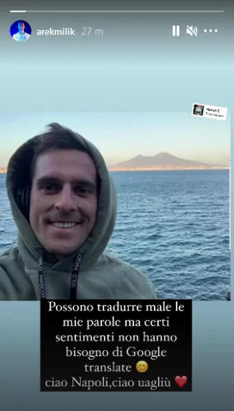 Durante un’intervista nel corso di un podcast registrato con una radio polacca, Arek Milik aveva spiegato di essere stanco dei tifosi del Napoli che lo assalivano per strada. Tramite una storia sul proprio profilo Instagram, l’attaccante ha voluto specificare che le sue parole sarebbero state travisate, o meglio, tradotte erronaemente dal polacco all’italiano. Ecco quanto dichiarato: