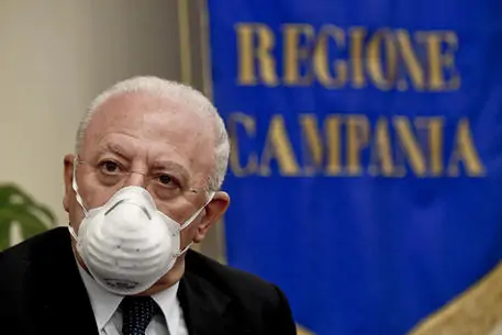 Il presidente della regione Campania Vincenzo De Luca, nella sede della Giunta a Napoli, alla conferenza stampa di presentazione di ' Le vie dell' Amicizia' il concerto diretto dal maestro Riccardo Muti previsto nell'area dei templi di Paestum il prossimo 5 luglio, 24 giugno 2020 ANSA / CIRO FUSCO