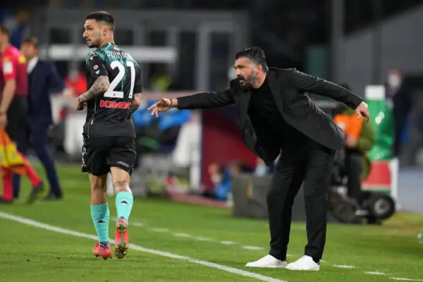 NAPLES, ITALY - APRIL 18: Gennaro Gattuso Italian coach of SSC Napoli and Matteo Politano during the Serie A match between SSC Napoli and FC Internazionale at Stadio Diego Armando Maradona on April 18, 2021 in Naples, Italy Copyright: xFotoagenziax