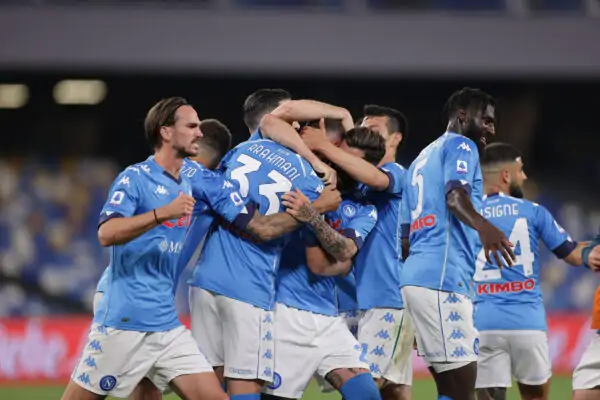 Amir Rrahmani of SSC Napoli celebrates with team mates after scoring the goal 1-0 during the Serie A football match between SSC Napoli and Hellas Verona at Diego Armando Maradona stadium in Napoli Italy, May 23rd, 2021. Photo Cesare Purini / Insidefoto CesarexPurini