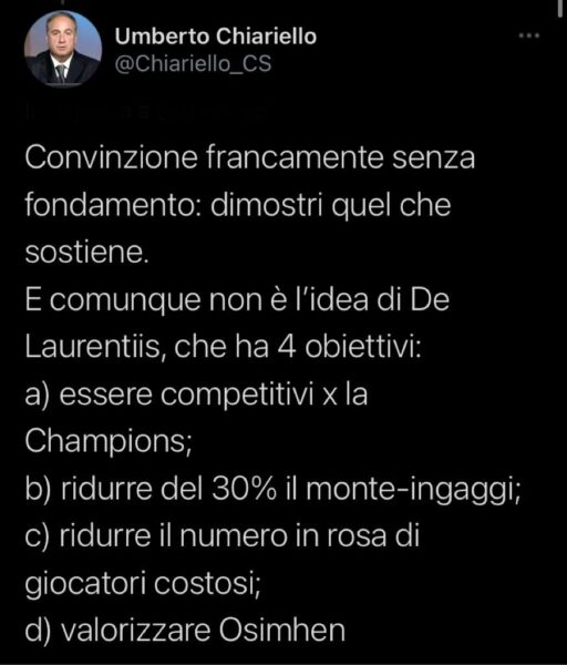 Il noto giornalista campano, Umberto Chiariello, risponde su Twitter ad un tifoso. All’interno del post di Chiariello sono elencati quelli che secondo il giornalista saranno gli obiettivi del presidente De Laurentiis nella prossima stagione: