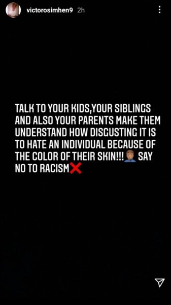 Victor Osimhen contro il razzismo. In una storia pubblicata sul suo profilo Instagram, il calciatore nigeriano lancia un messaggio molto importante: “Parlate con i vostri figli, i vostri fratelli e anche i vostri genitori bisogna farli capire quanto sia disgustoso odiare per il colore della loro pelle! Dici no al razzismo“.