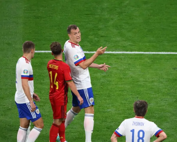 Saint Petersburg, Russia - 12 June 02021: Football. European Football Championship 2020. 1st round, Group B. Russia v Belgium. national team, Nationalteam player Artem Dzyuba, Dries Mertens MaksimxKonstantinov