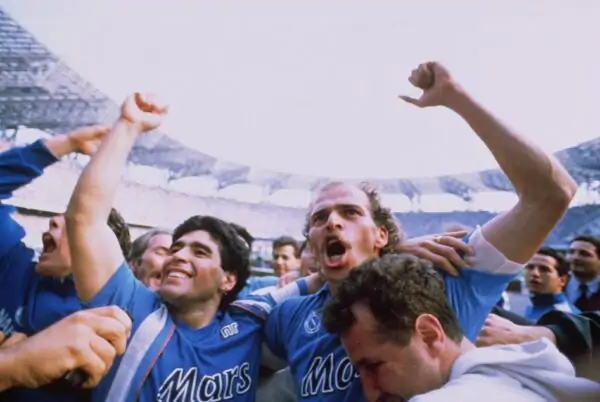 Diego Armando Maradona (li.) und Alemao (beide Neapel) feiern den Scudetto der Saison 1989/1990 - PUBLICATIONxINxGERxSUIxAUTxHUNxONLY (aflo391) Diego Armando Maradona left and Alemão both Naples celebrate the Scudetto the Season 1989 1990 PUBLICATIONxINxGERxSUIxAUTxHUNxONLY aflo391