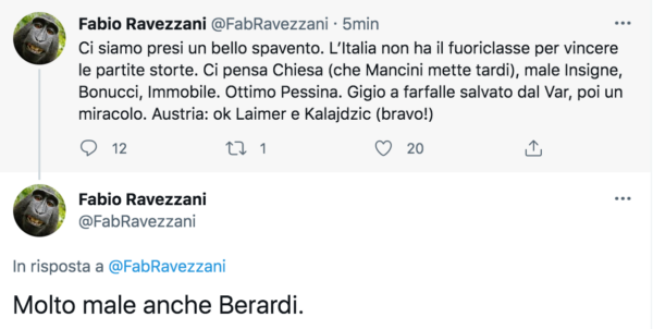 “Ci siamo presi un bello spavento. L’Italia non ha il fuoriclasse per vincere le partite storte. Ci pensa Chiesa (che Mancini mette tardi), male Insigne, Bonucci, Immobile. Ottimo Pessina. Gigio a farfalle salvato dal Var, poi un miracolo. Austria: ok Laimer e Kalajdzic (bravo!). Molto male anche Berardi“.