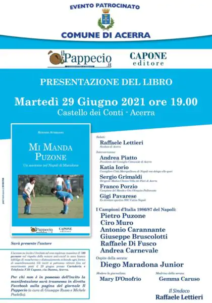 Si terrà martedì 29 giugno alle ore 19 nel Cortile del Castello dei Conti di Acerra la presentazione del libro ‘Mi manda Puzone‘. Un acerrano nel Napoli di Maradona, edito dal Pappecio e Capone editore, con il Patrocinio del Comune.