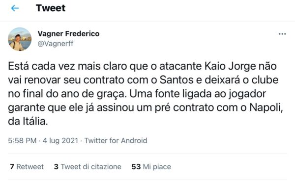 “È sempre più chiaro che l’attaccante Kaio Jorge non rinnoverà il contratto con il Santos e lascerà il club a fine anno gratuitamente. Una fonte collegata al giocatore garantisce che ha già firmato un pre-contratto con il Napoli“. Queste le parole pubblicate poco fa da Vagner Frederico, giornalista brasiliano, attraverso la sua pagina Twitter.