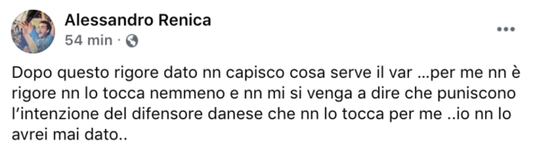 “Dopo questo rigore dato non capisco cosa serve il var …per me non è rigore non lo tocca nemmeno e non mi si venga a dire che puniscono l’intenzione del difensore danese che non lo tocca per me ..io non lo avrei mai dato..“.