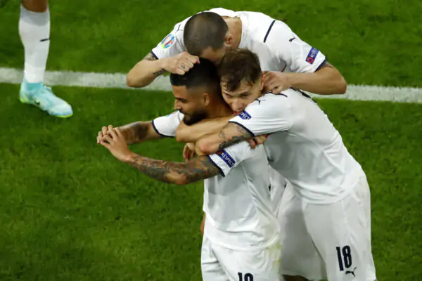 Lorenzo Insigne of Italy celebrates with Nicolo Barella and Leonardo Bonucci after scoring the goal of 0-2 during the UEFA EURO, EM, Europameisterschaft,Fussball 2020 round of 8 football match between Belgium and Italy at football arena in Munich Germany, July 2nd, 2021. Photo Matteo Ciambelli / Insidefoto matteoxciambelli