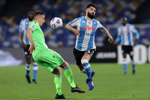Adam Marusic of SS Lazio and Elseid Hysaj of SSC Napoli compete for the ball during the Serie A football match between SSC Napoli and SS Lazio at Diego Armando Maradona Stadium in Napoli Italy, April 22th 2021. Photo Cesare Purini / Insidefoto cesarexpurini