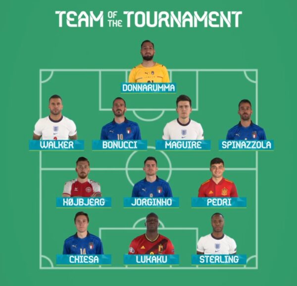 Sono cinque i giocatori della Nazionale italiana a figurare nella Top 11 di Euro 2020. La formazione è stata scelta da un gruppo di osservatori tecnici. Di migliori undici del torneo è stato escluso Lorenzo Insigne. Ecco la formazione: