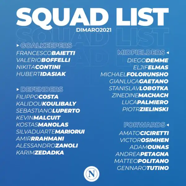 Il Napoli è pronto per iniziare il ritiro a Dimaro Folgarida. La squadra partirà domani mattina e arriverà in Trentino nel primo pomeriggio. Intanto, la società ha diramato la lista dei convocati. Ci sono Elmas, Lobotka e Zielinski (che raggiungerà la squadra con qualche giorno di ritardo), mentre mancano tutti gli altri giocatori impegnati in Europei e Coppa America. Out anche Faouzi Ghoulam. Ecco la lista completa.