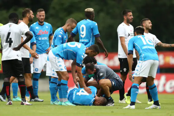 Italy: Preseason 2021-22 SSC Napoli friendly match SSC Napoli vs Football Club Pro Vercelli 1892 SSC Napoli s German midfielder Diego Demme ingiuried during the pre-season friendly between ssc napoli vs Football Club Pro Vercelli 1892, on the tenth day of ssc napoli s pre-season training camp in Dimaro Folgarida ABPH4335 Copyright: xAntonioxBalascox