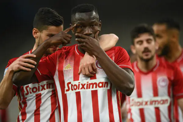 Griechenland Fußball Super League Play-offs Saison 2020-2021 Olympiastadion OAKA Athen, 4. April 2021 AEK Athen - Olympiakos Piräus 1:5 Torjubel - der Torschütze zum 1:0, Mady Camara M, Piräus jubelt mit dem Finger an der Stirn AEK Athen - Olympiakos Piräus *** Greece Football Super League Play offs Season 2020 2021 Olympic Stadium OAKA Athens, 4 April 2021 AEK Athens Olympiakos Piraeus 1 5 goal cheer the scorer for 1 0, Mady Camara M, Piraeus cheers with finger on forehead AEK Athens Olympiakos Piraeus PUBLICATIONxNOTxINxGRE ANE5276228