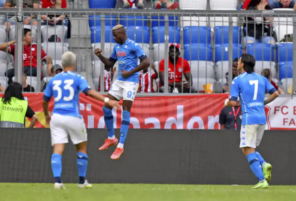 31.07.2021, Fussball 1. Bundesliga 2021/2022, Audi Football Summit, Testspiel, FC Bayern München - SSC Neapel, in der Allianz-Arena München. Victor Osimhen mitte, Neapel hat das 1:0 Tor erzielt und jubelt. *** 31 07 2021, Football 1 Bundesliga 2021 2022, Audi Football Summit, Test match, FC Bayern Munich SSC Napoli, at Allianz Arena Munich Victor Osimhen center, Napoli scored the 1 0 goal and cheers.