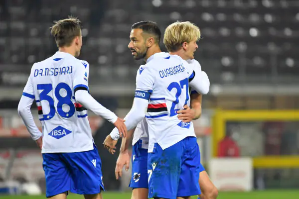 Torino v Sampdoria, Serie A, football, Torino, Italy Torino, Italy. 30th, November 2020. Mikkel Damsgaard 38 and Morten Thorsby 18 celebrate with goalscorer Fabio Quagliarella 27 of Sampdoria in the Serie A match between Torino and Sampdoria at Stadio Olimpico in Torino. Torino Italy PUBLICATIONxNOTxINxDENxNOR Copyright: xGonzalesxPhoto/TommasoxFimianox