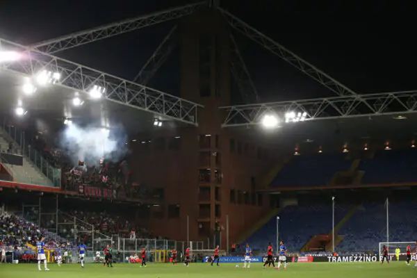 Genoa, Italy, 23rd August 2021. AC Milan fans let off smoke bombs after the side took a 1-0 lead during the Serie A match at Luigi Ferraris, Genoa. Picture credit should read: Jonathan Moscrop / Sportimage PUBLICATIONxNOTxINxUK SPI-1147-0009