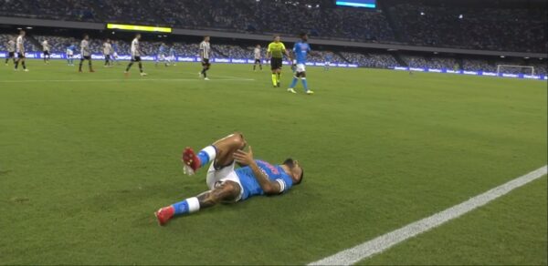 Nonostante le condizioni non ottimali, il capitano azzurro ha comunque provato ad esultare al momento della rete di Koulibaly però, non potendo correre per l’infortunio, è arrivato il senegalese a sollevarlo.