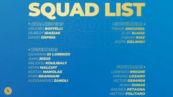 I convocati: Ospina, Boffelli, Idasiak, Di Lorenzo, Juan Jesus, Koulibaly, Malcuit, Manolas, Rrahmani, Zanoli, Anguissa, Elmas, Fabian Ruiz, Zielinski, Insigne, Lozano, Osimhen, Ounas, Petagna, Politano.