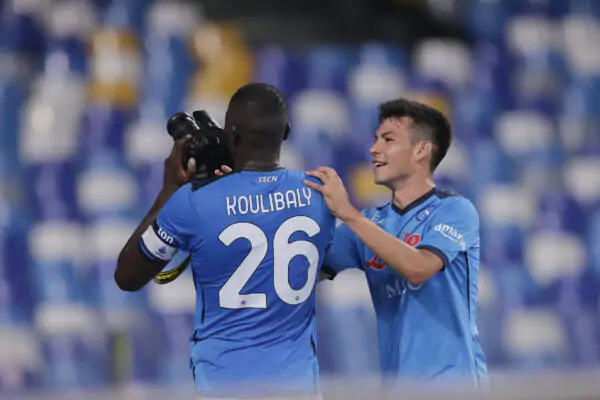 Kalidou Koulibaly of SSC Napoli celebrates with team mates after scoring the goal 2-1 during the Serie A 2021/2022 football match between SSC Napoli and Juventus FC at Diego Armando Maradona stadium in Napoli Italy, September 11th, 2021. Photo Cesare Purini / Insidefoto CesarexPurini
