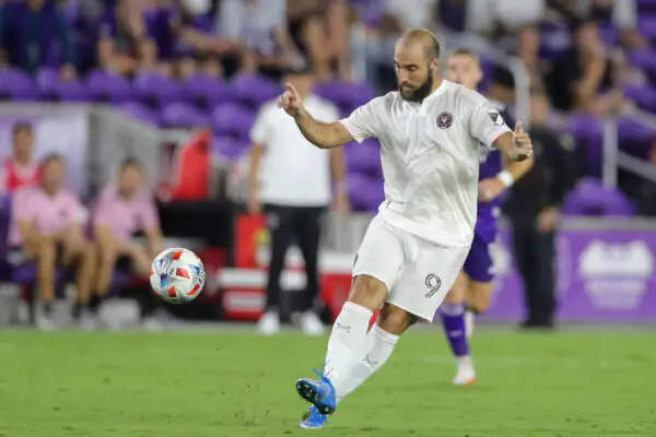 August 27, 2021: Inter Miami forward GONZALO HIGUAIN 9 passes the ball during the MLS, Fussball Herren, USA Orlando City vs Inter Miami soccer match at Exploria Stadium in Orlando, Fl on August 27, 2021. - ZUMAk149 20210827_zsp_k149_010 Copyright: xCoryxKnowltonx