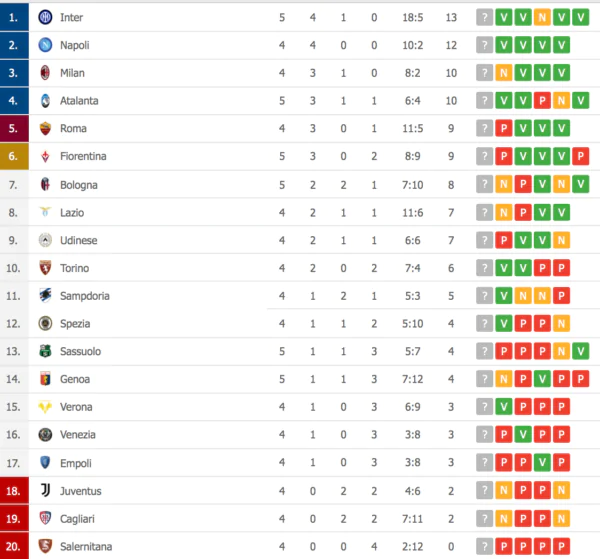 Aspettando gli altri match della quinta giornata, ecco la classifica di Serie A: