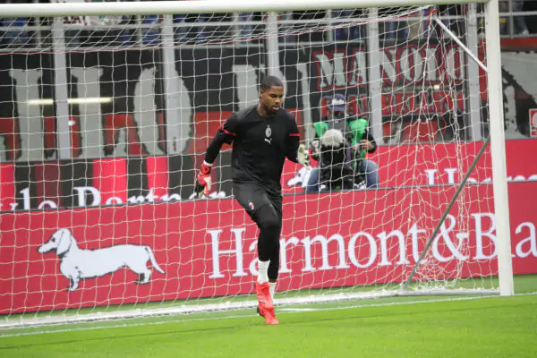 AC Milan vs Venezia FC - Serie A Mike Maignan of AC Milan in action prior the Serie A football match between AC Milan and Venezia FC at Stadio Giuseppe Meazza in Milano, Italy, on September 22 2021 . Milan wins 2-0. Milan Italy Copyright: MairoxCinquetti