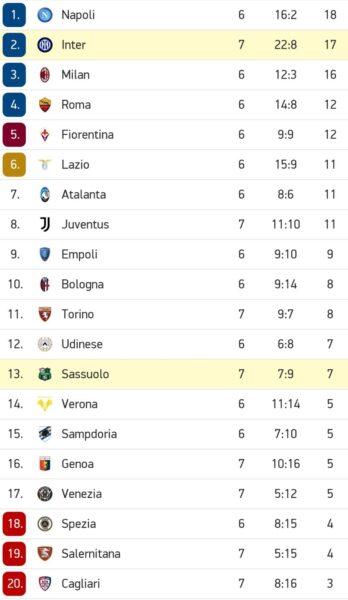 L’Inter torna quindi al secondo posto in solitaria, in attesa della prova del Milan, a -1 dal Napoli. Il Sassuolo invece resta a 7 punti, tredicesimo in classifica.