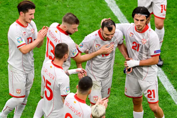 AMSTERDAM, NETHERLANDS - JUNE 21: Goran Pandev of North Macedonia is embraced by teammates Enis Bardi, Stefan Ristovski and Eljif Elmas as he is substituted off during the UEFA Euro 2020 Championship Group C match between North Macedonia and The Netherlands at Johan Cruijff Arena on June 21, 2021 in Amsterdam, Netherlands. (Photo by Olaf Kraak - Pool/Getty Images)