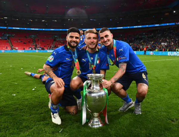 LONDON, ENGLAND - JULY 11: (L-R) Lorenzo Insigne, Ciro Immobile and Marco Verratti of Italy celebrate with The Henri Delaunay Trophy following his team's victory in the UEFA Euro 2020 Championship Final between Italy and England at Wembley Stadium on July 11, 2021 in London, England. (Photo by Claudio Villa/Getty Images)