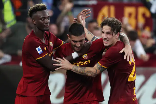 ROME, ITALY - OCTOBER 03: Lorenzo Pellegrini of AS Roma celebrates with teammates Tammy Abraham and Nicolo Zaniolo after scoring their side's first goal during the Serie A match between AS Roma v Empoli FC at Stadio Olimpico on October 03, 2021 in Rome, Italy. (Photo by Paolo Bruno/Getty Images)