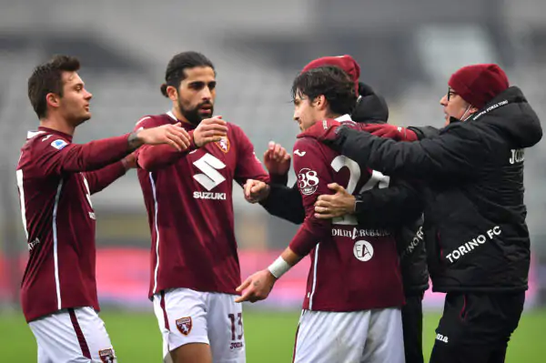 TURIN, ITALY - DECEMBER 20: Simone Verdi of Torino celebrates with Ricardo Rodríguez and teammates after scoring their team's first goal during the Serie A match between Torino FC and Bologna FC at Stadio Olimpico di Torino on December 20, 2020 in Turin, Italy. Sporting stadiums around Italy remain under strict restrictions due to the Coronavirus Pandemic as Government social distancing laws prohibit fans inside venues resulting in games being played behind closed doors. (Photo by Valerio Pennicino/Getty Images)