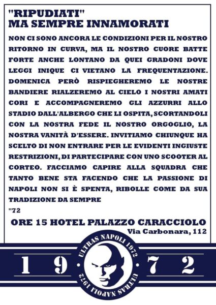 “Ripudiati, ma sempre innamorati. Non ci sono ancora le condizioni per il nostro ritorno in Curva, ma il nostro cuore batte forte anche lontano da quei gradoni dove leggi inique ci vietano la frequentazione. Domenica però rispiegheremo le nostre bandiere, rialzeremo al cielo i nostri amati cori e accompagneremo gli azzurri allo stadio dall’albergo che li ospita, scortandoli con la nostra fede, il nostro orgoglio, la nostra vanità d’essere. Invitiamo chiunque ha scelto di non entrare per le evidenti ingiuste restrizioni di partecipare con uno scooter al corteo. Facciamo capire alla squadra che tanto bene sta facendo che la passione di Napoli non si è spenta, ribolle come da sua tradizione da sempre”.