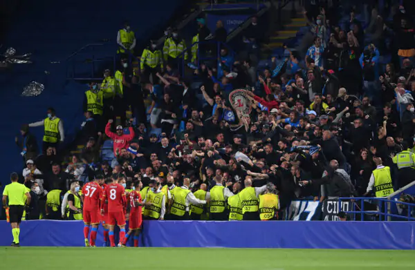 LEICESTER, ENGLAND - SEPTEMBER 16: Victor Osimhen of SSC Napoli (obscured) celebrates after scoring their side's second goal as fans celebrate during the UEFA Europa League group C match between Leicester City and SSC Napoli at The King Power Stadium on September 16, 2021 in Leicester, England. (Photo by Shaun Botterill/Getty Images)