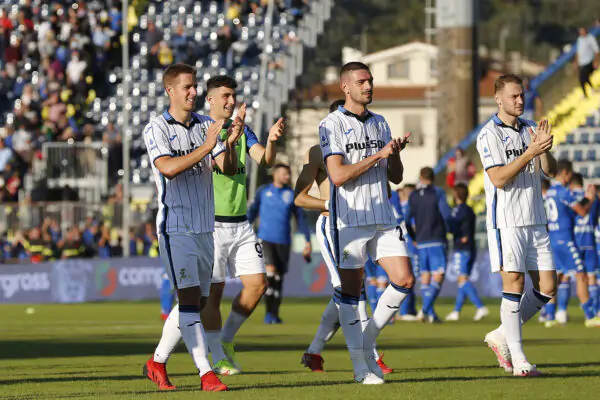 EMPOLI, ITALY - OCTOBER 17: Mario Pasalic, Merih Demiral and Teun Koopmeiners of Atanta BC greet the fans during the Serie A match between Empoli FC and Atalanta BC at Stadio Carlo Castellani on October 17, 2021 in Empoli, Italy. (Photo by Gabriele Maltinti/Getty Images)