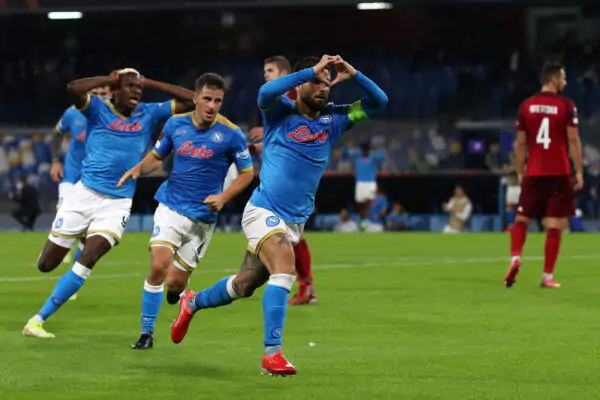 NAPLES, ITALY - OCTOBER 21: Lorenzo Insigne of SSC Napoli celebrates after scoring their sides first goal during the UEFA Europa League group C match between SSC Napoli and Legia Warszawa at Stadio Diego Armando Maradona on October 21, 2021 in Naples, Italy. (Photo by Francesco Pecoraro/Getty Images)