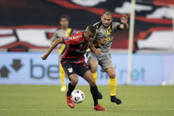 CURITIBA, BRAZIL - SEPTEMBER 30: Erick of Athletico-PR fights for the ball with Walter Gargano of Peñarol during a semi final second leg match between Athletico Paranaense and Peñarol as part Copa CONMEBOL Sudamericana 2021 at Arena da Baixada on September 30, 2021 in Curitiba, Brazil. (Photo by Liamara Polli-Pool/Getty Images)