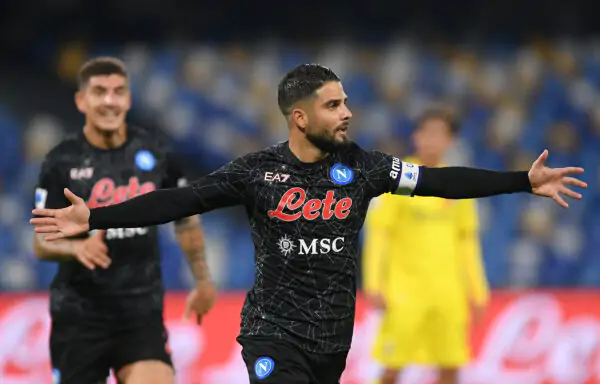 NAPLES, ITALY - OCTOBER 28: Lorenzo Insigne of SSC Napoli celebrates after scoring their side's third goal during the Serie A match between SSC Napoli and Bologna FC at Stadio Diego Armando Maradona on October 28, 2021 in Naples, Italy. (Photo by Francesco Pecoraro/Getty Images)