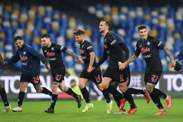 NAPLES, ITALY - OCTOBER 28: Lorenzo Insigne, Matteo Politano, Dries Mertens, Fabian and Giovanni Di Lorenzo of SSC Napoli celebrate their side's victory after the Serie A match between SSC Napoli and Bologna FC at Stadio Diego Armando Maradona on October 28, 2021 in Naples, Italy. (Photo by Francesco Pecoraro/Getty Images)