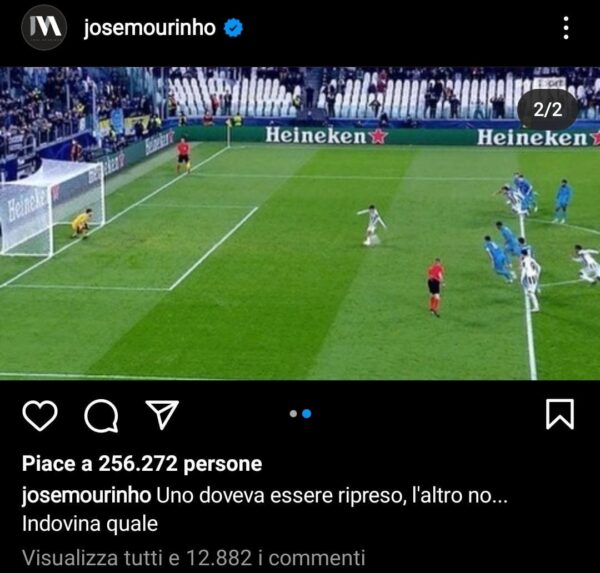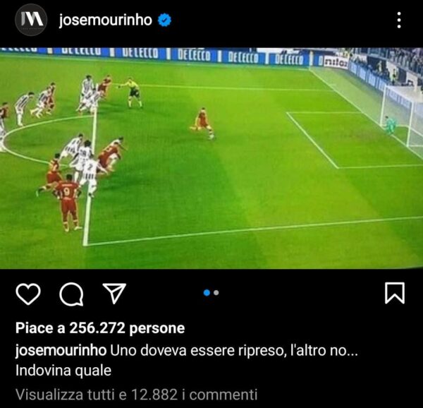 José Mourinho riaccende le polemiche contro le scelte arbitrali di Juventus–Roma dello scorso 17 ottobre. Lo Special One, con una foto su Instagram, ha puntualizzato sulla mancata ripetizione del calcio di rigore di Veretout contro i bianconeri.