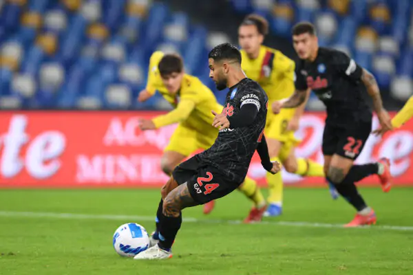 NAPLES, ITALY - OCTOBER 28: Lorenzo Insigne of SSC Napoli scores their side's third goal from the penalty spot during the Serie A match between SSC Napoli and Bologna FC at Stadio Diego Armando Maradona on October 28, 2021 in Naples, Italy. (Photo by Francesco Pecoraro/Getty Images)