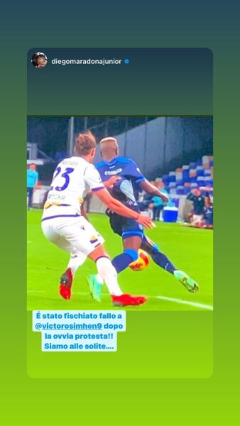 Uno di questi vede un difensore del Verona strattonare da dietro vistosamente l’attaccante del Napoli, che poi protesta. Diego Maradona Jr ha così immortalato il momento incriminato e pubblicato una Instagram Stories, scrivendo: “È stato fischiato fallo a Osimhen dopo la protesta! Siamo alle solite…“.